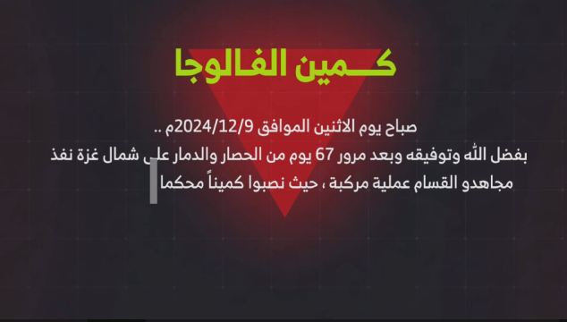 كما عرضت القسام مشاهد قنص واستهداف لجنود الكيان الصهيوني، من مسافة الصفر، وأسفر عن كمين الفالوجا قتلى وجرحي في صفوف الاحتلال.