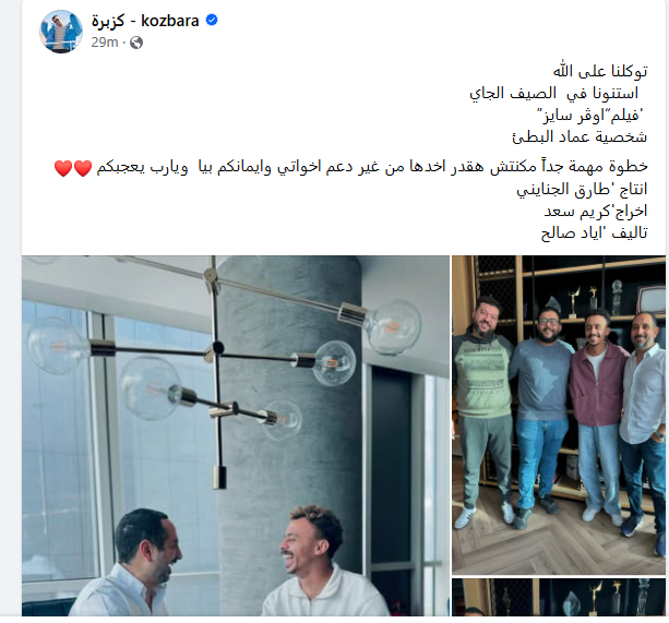 يأتي هذا التعاون بعد النجاحات الكبيرة التي حققها الثنائي في فيلمي "الحريفة" بجزئيه الأول والثاني، حيث كتب كزبرة: "توكلنا على الله، استنونا في الصيف الجاي فيلم "أوڤر سايز"، شخصية عماد البطيء".