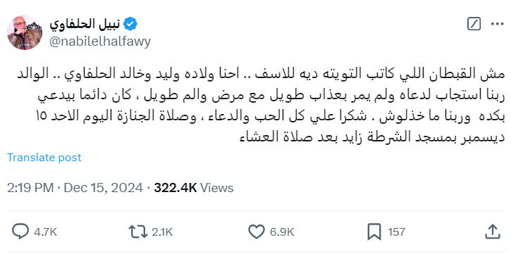 كما اختتموا تغريدتهم بالكشف عن موعد ومكان صلاة جنازة الراحل، قائلين: "وصلاة الجنازة اليوم الاحد ١٥ ديسمبر بمسجد الشرطة زايد بعد صلاة العشاء.".