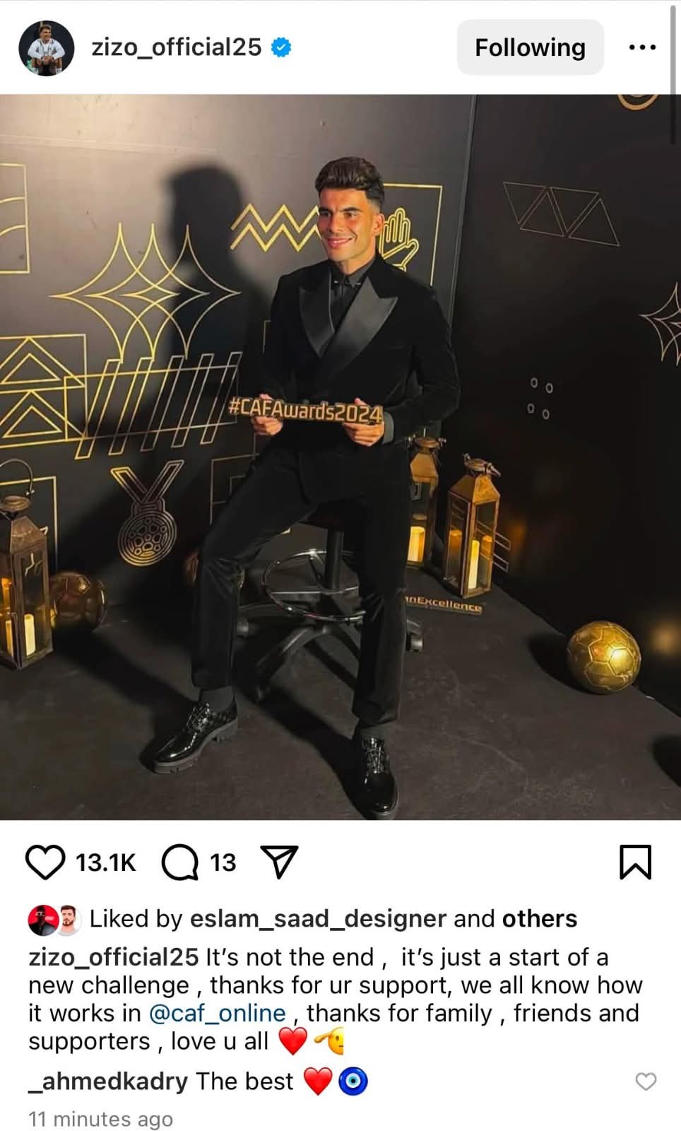 وكتب زيزو على إنستجرام : "إنها ليست النهاية، إنها مجرد بداية لتحدي جديد، شكرًا على دعمكم، فنحن جميعًا نعلم كيف تسير الأمور في الكاف ، شكرًا للعائلة والأصدقاء والداعمين، نحبكم جميعًا