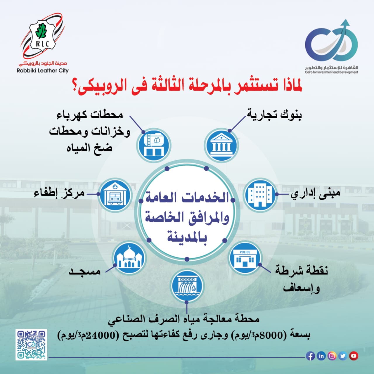 وتم انشاء محطة معالجة صرف صناعي على اعلى المعايير العالمية تستوعب 8 الاف م3/ اليوم وجاري الانتهاء من تطويرها لتصل قدرتها الاستيعابية الى 24 الف م3/ اليوم، كما حرصت القاهرة للاستثمار والتطوير على إقامة مركز تكنولوجي على اعلى المستويات لتقديم الدعم الفني لاصحاب المشروعات وكذلك مركز تدريب لتاهيل العمالة ومنطقة خدمية راقية تشمل بنوك ومبنى اداري ومطاعم ووحدة اسعاف واطفاء.
