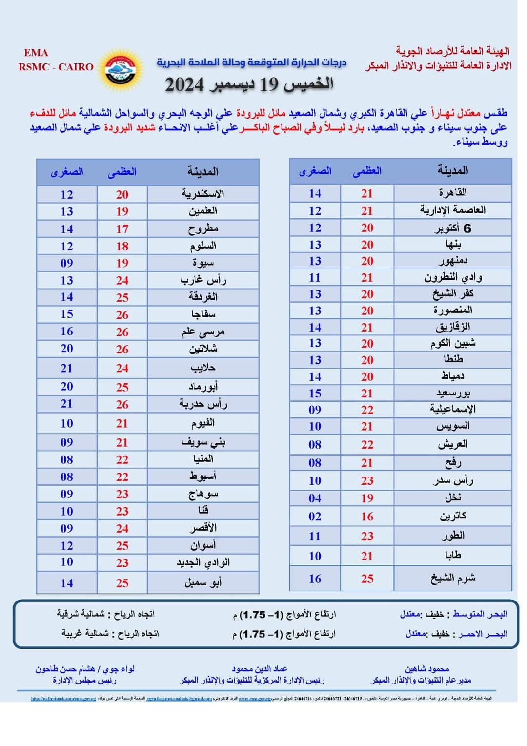 يشهد اليوم الخميس الموافق 19 ديسمبر، طقس معتدل الحرارة نهاراً على القاهرة الكبرى وشمال الصعيد مائل للبرودة على الوجه البحري والسواحل الشمالية مائل للدفء على جنوب سيناء وجنوب الصعيد.
