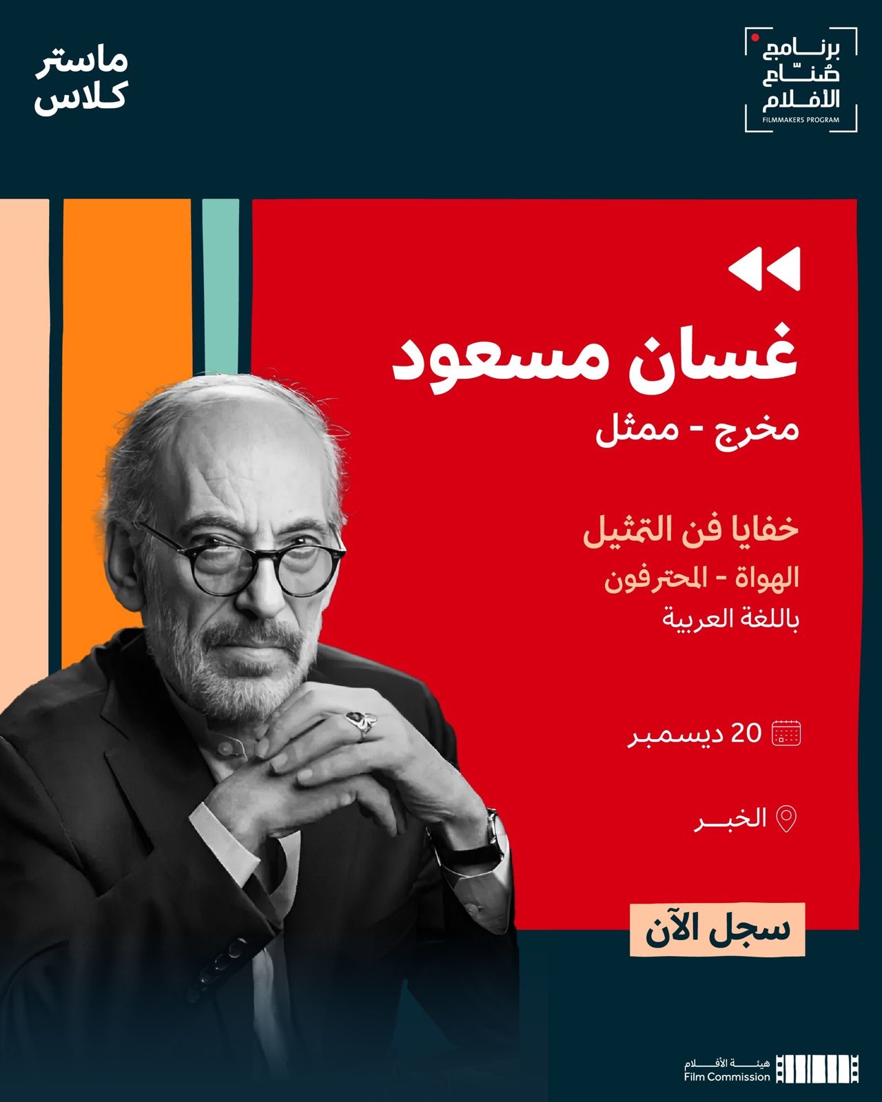 تستضيف هيئة الأفلام السعودية ضمن برنامج صناع الأفلام بموسمه الرابع الفنان والمخرج القدير غسان مسعود، في ماستر كلاس مميز بعنوان "خفايا فن التمثيل"، والذي سيُقام في مدينة الخبر غدا الجمعة 20 ديسمبر.