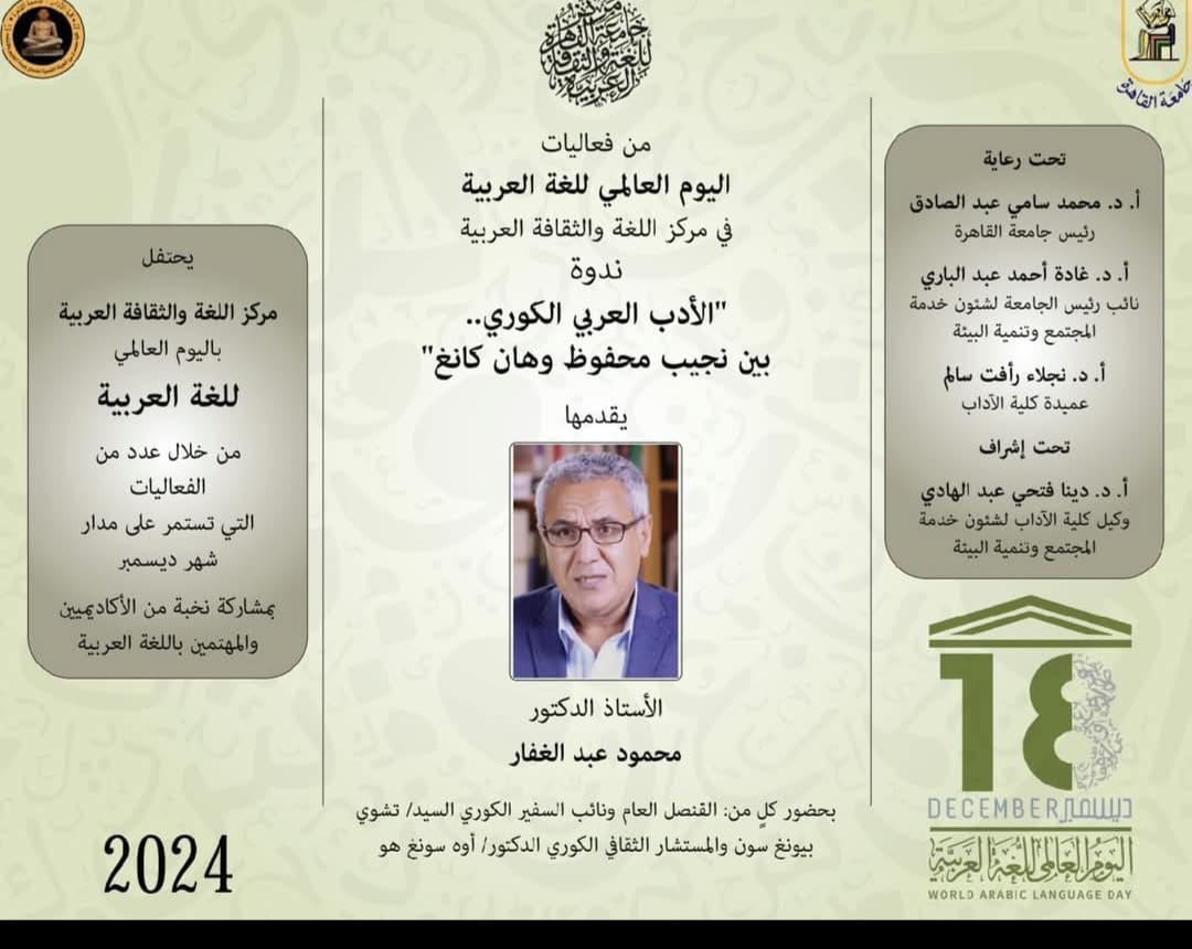 يقيم مركز اللغة والثقافة العربية بجامعة القاهرة، ضمن فعاليات الاحتفال باليوم العالمي للغة العربية، ندوة تحت عنوان "الأدب العربي والكوري.. بين نجيب محفوظ وهان كانغ".