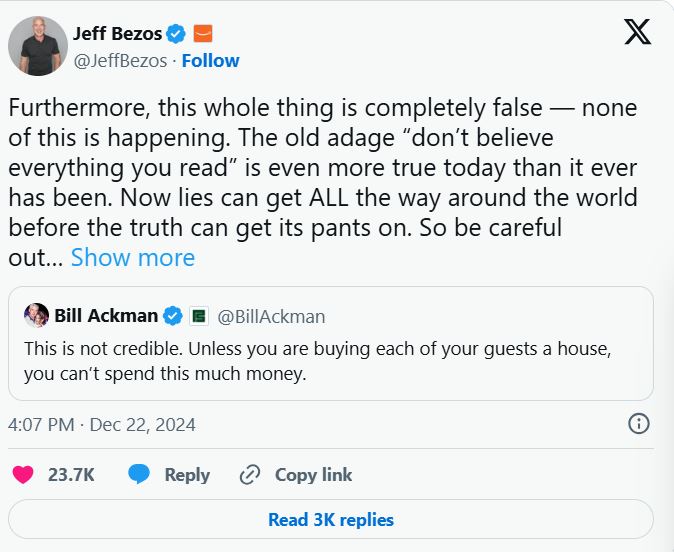 وزعم مصدر في التقرير أن تكاليف حفل الزفاف بأكملها ستصل إلى 600 مليون دولار، ولكن مالك صحيفة واشنطن بوست لجأ اليوم الأحد إلى موقع إكس (تويتر سابقًا) حيث أكد بأن التقرير غير صحيح. وبدأ منشوره بالقول: "علاوة على ذلك، فإن هذا الأمر برمته كاذب تمامًا - لا شيء من هذا يحدث".