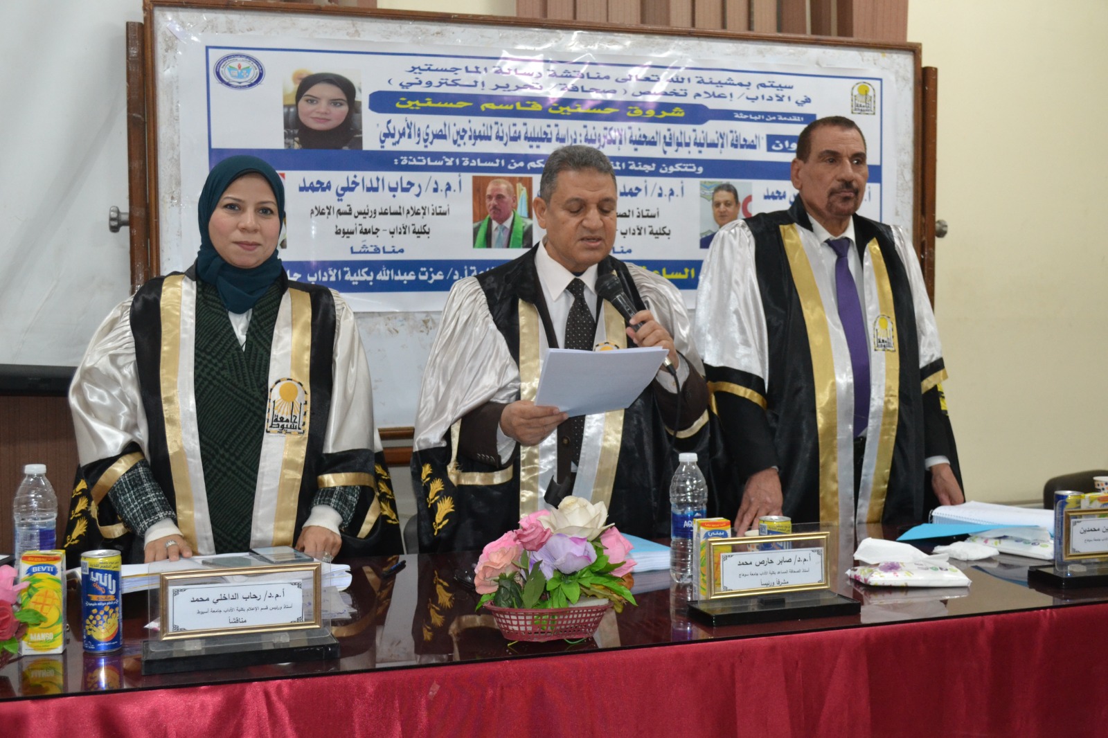 والدكتورة رحاب الداخلي رئيس قسم الإعلام بجامعة أسيوط "مناقشا داخليا".