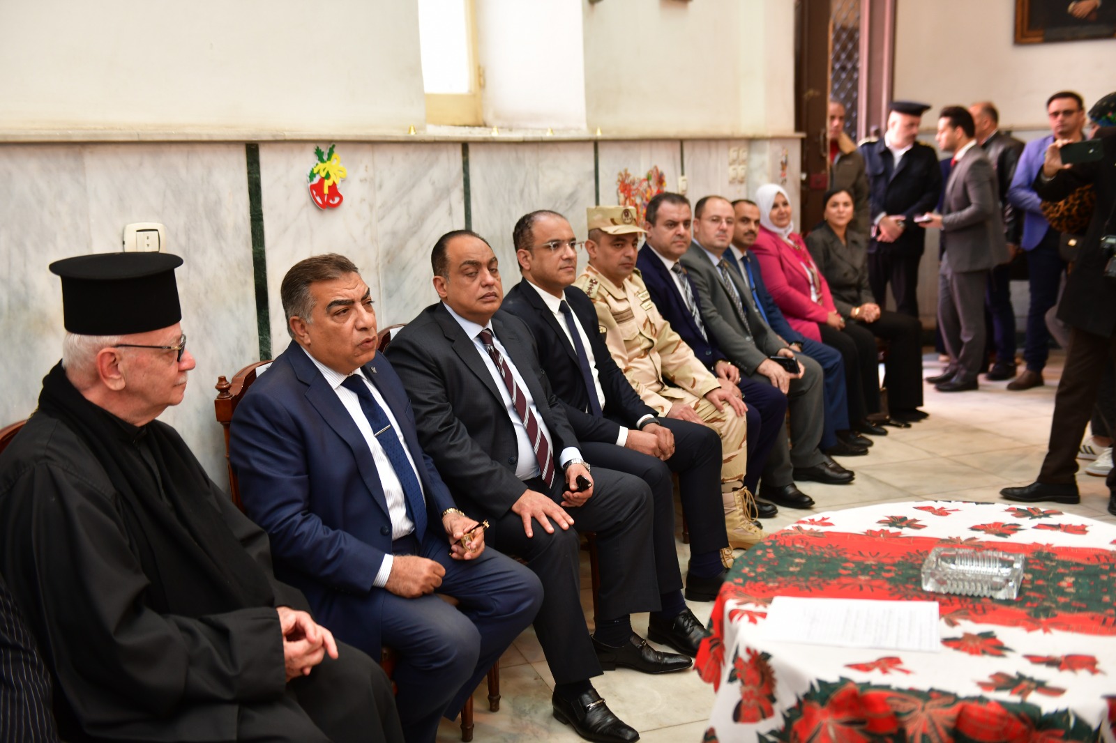 حيث رافق " المحافظ " خلال تقديم التهنئة الدكتور أحمد العدل نائب المحافظ ، واللواء محمد صلاح السكرتير العام للمحافظة ، واللواء خالد عيد رئيس جهاز المخابرات العامة لمنطقة شرق الدلتا ، واللواء حسام عبدالعزيز مدير أمن الدقهلية ، والعميد أ.ح الهيثم عواد المستشار العسكري للمحافظة ، والعقيد أحمد المرسي وكيل مكتب المخابرات الحربيه بالدقهليه ، والنائبة ولاء عبدالفتاح عضو مجلس النواب ، والشيخ صفوت نظير وكيل وزارة الأوقاف ، والدكتور محمد رشوان رئيس قطاع المعاهد الأزهرية بالدقهليه ، والمهندس خالد نصر رئيس مجلس إدارة شركة مياه الشرب والصرف الصحى ، والدكتور تامر مدكور وكيل وزارة الصحه ، والدكتوره ماجده جلاله وكيل وزارة التضامن الاجتماعي ، والدكتور السيد حسنين مدير مديرية الطب البيطري ، و محمد أمين رئيس حي شرق المنصوره ، و أحمد عبدالعظيم رئيس حي غرب المنصوره.