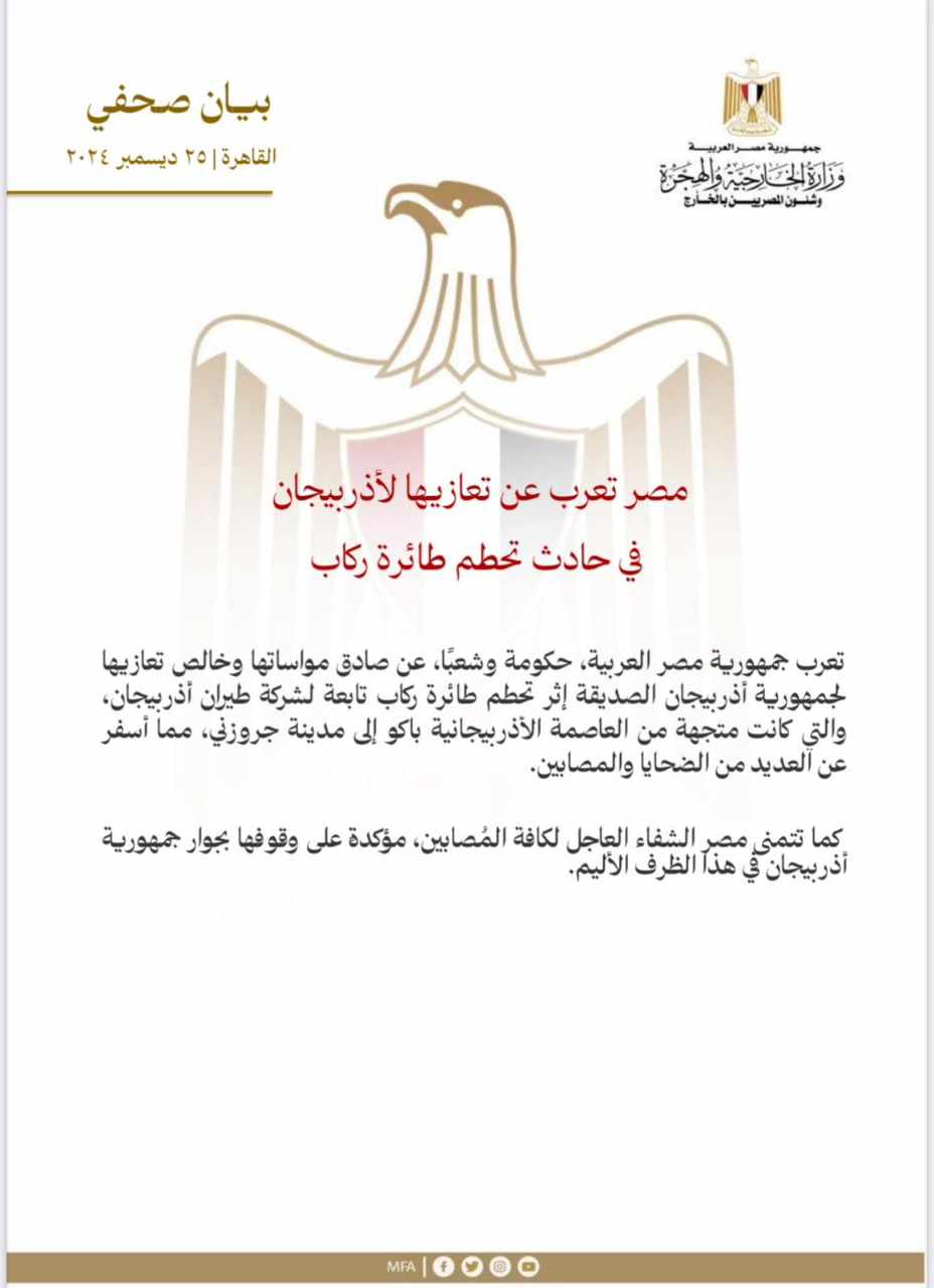 تعرب جمهورية مصر العربية، حكومة وشعبًا، عن صادق مواساتها وخالص تعازيها لجمهورية أذربيجان الصديقة إثر تحطم طائرة ركاب تابعة لشركة طيران أذربيجان، والتي كانت متجهة من العاصمة الأذربيجانية باكو إلى مدينة جروزني، مما أسفر عن العديد من الضحايا والمصابين.