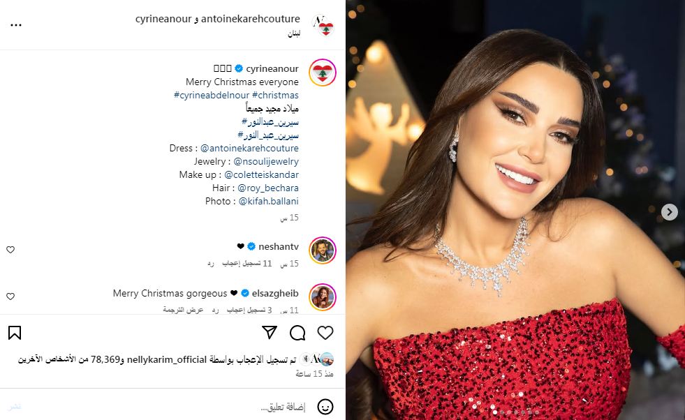 حرصت النجمة اللبنانية سيرين عبدالنور على الاحتفال بالكريسماس بابهي صورها بأسلوب مواكب لأحدث صيحات الموضة العالمية لتنافس عارضات الأزياء.