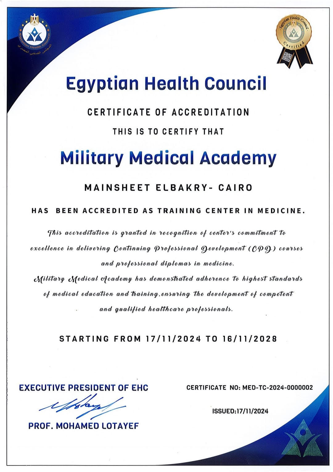 مركز التعليم الطبى والتدريب بالأكاديمية الطبية العسكرية يحصل على شهادة الاعتماد البرامجى