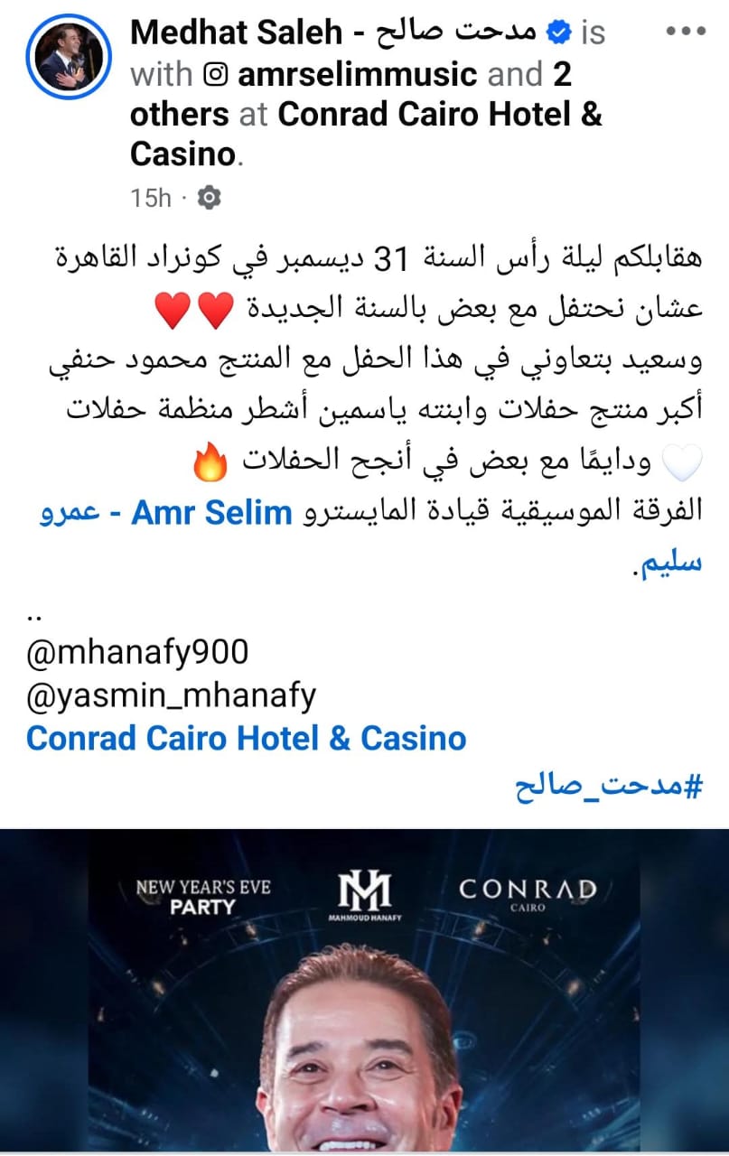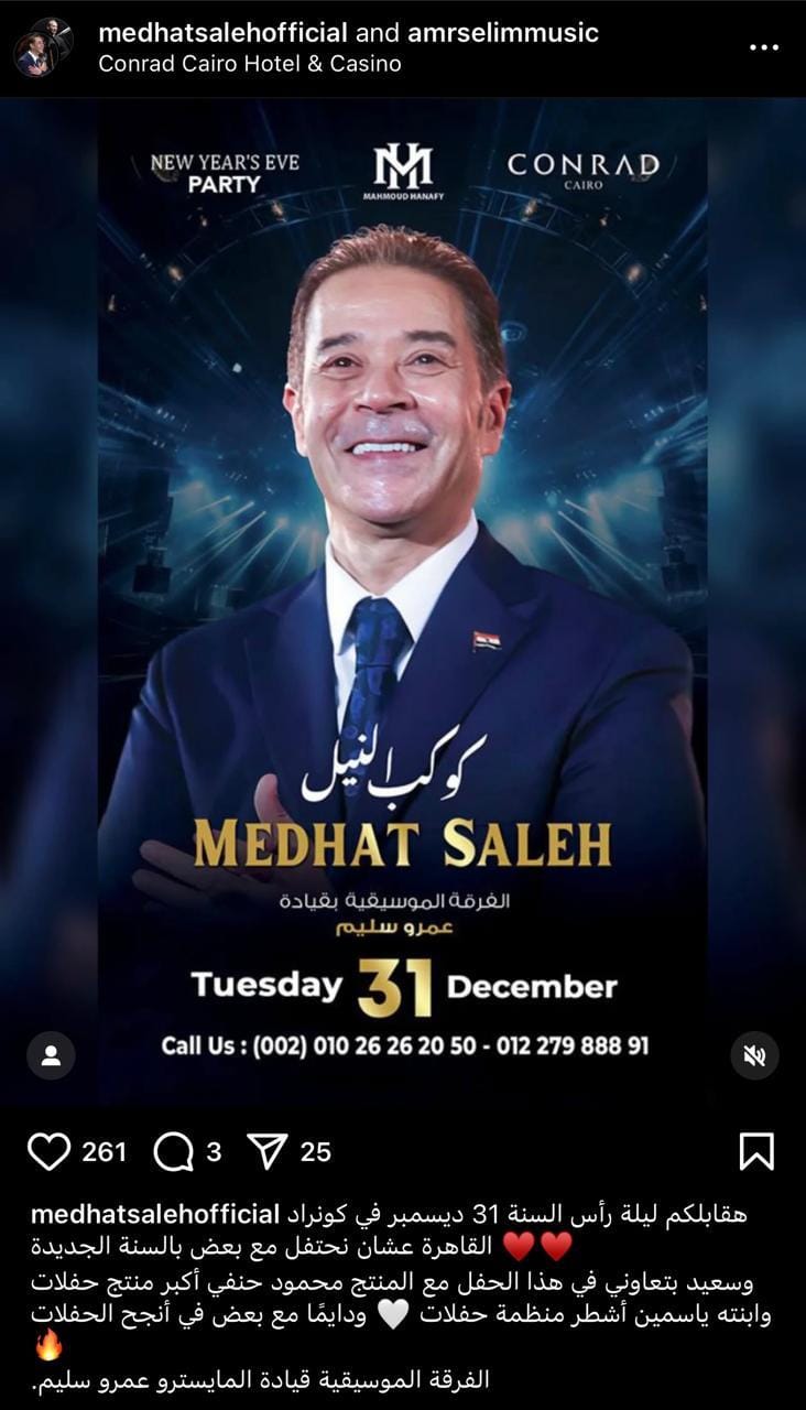 أعلن النجم مدحت صالح، عن استعداده لإحياء حفل غنائي ضخم ليلة رأس السنة 31 ديسمبر، وذلك عبر حساباته الرسمية على مواقع التواصل الاجتماعي فيسبوك وإنستجرام.