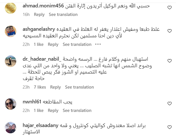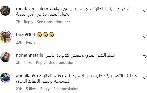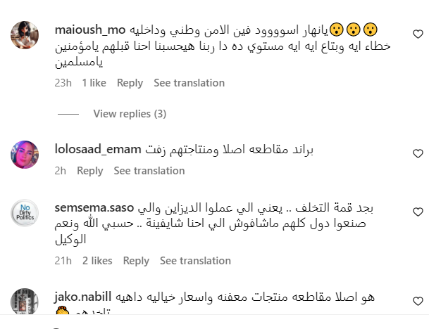 كما علق آخرون: " ده مش مجرد فعل بسيط جرح مشاعرنا دا اسمه ازدراء أديان المفروض إن القانون بيحاسب عليه .. المفروض المنتج ميكونش موجود فى المحلات من البداية اصلًا .. محلات حضراتكم بالنسبالنا بقت بلاك ليست".