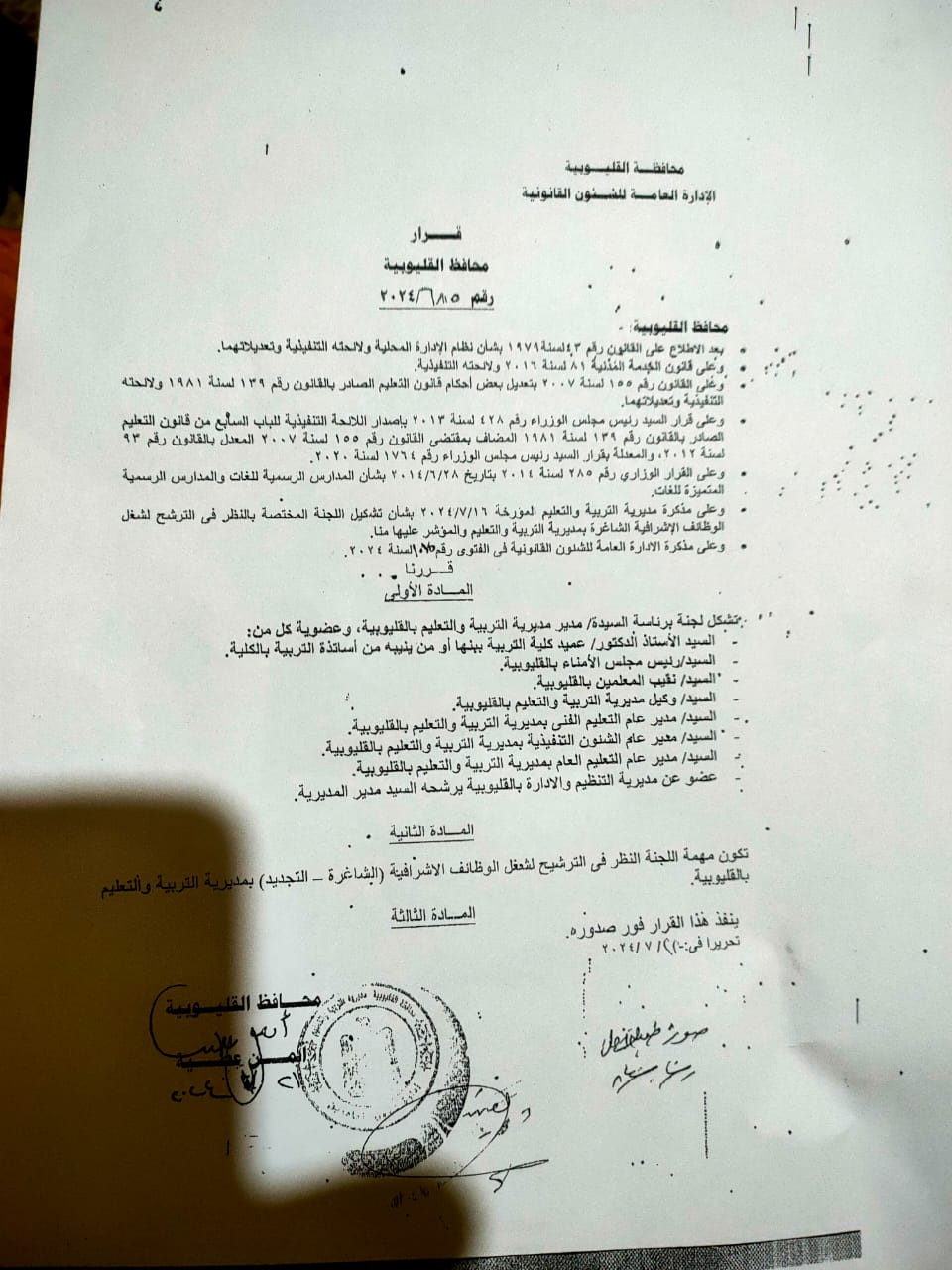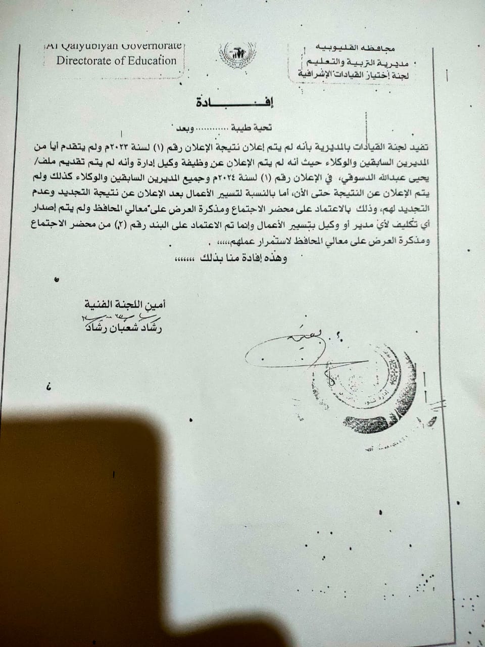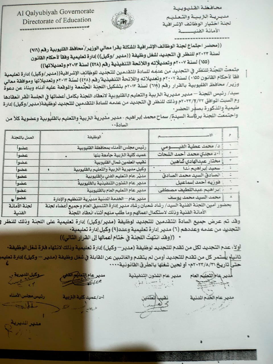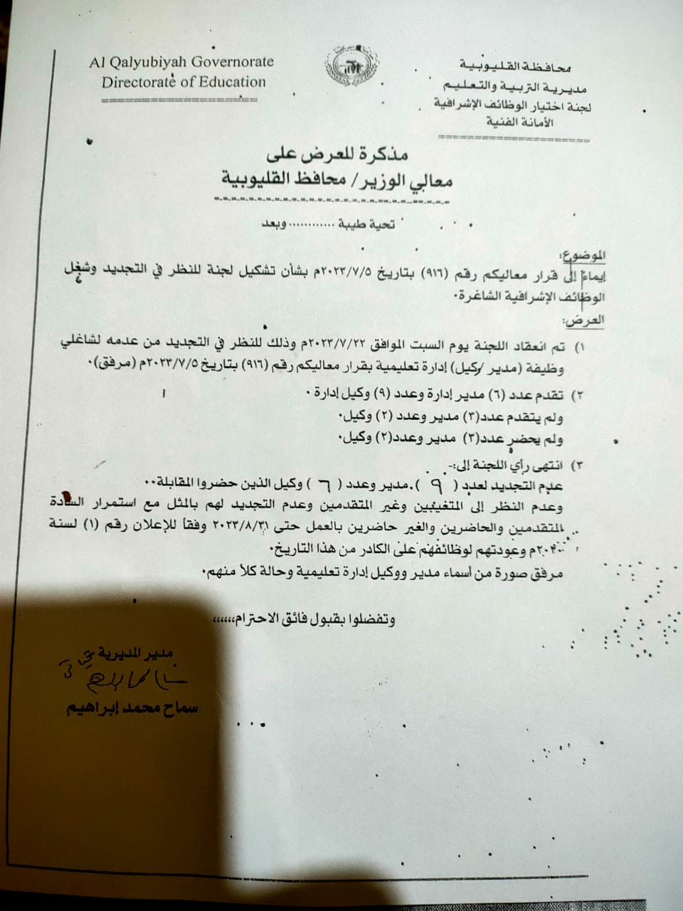الأخطر فى قضية تلك المسابقة والتى انتهت لعدم التجديد لهؤلاء المديرين والوكلاء للإدارات هو انه بطريقة أو بأخرى تم عمل مذكرة للعرض على محافظ القليوبية وزيلت ببندين كان الثاني منهم بمثابة المحلل والذي مر دون لفت الأنظار حيث جاء البند الأول فى مذكرة العرض على محافظ القليوبية اولا: عدم التجديد لكل من تقدم للتجديد الوظيفة مدير أو وكيل ادارة تعليمية وذلك لانتهاء فترة شغل الوظيفة.