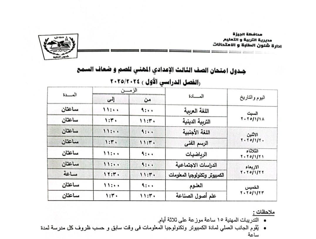 نشرت مديرية التربية والتعليم والتعليم الفني في محافظة الجيزة، جداول امتحانات الشهادة الإعدادية والتي تنطلق يوم السبت الموافق ١٨ يناير وحتى الخميس ٢٣ يناير ٢٠٢٥ .