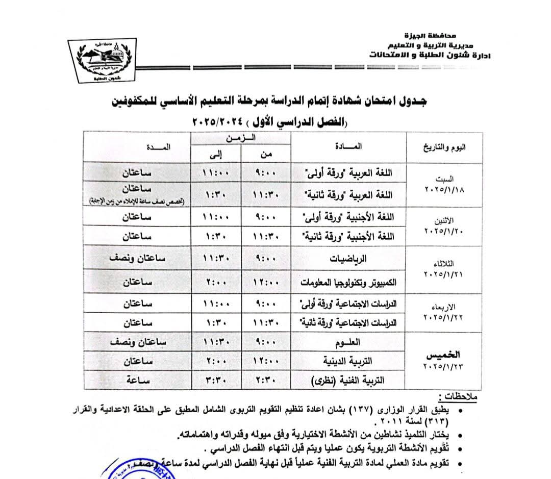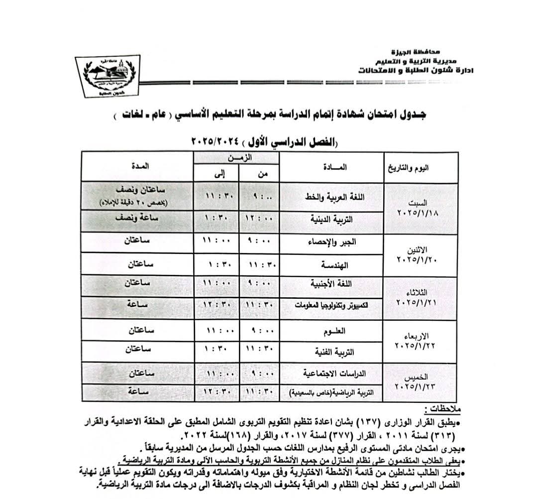 ننشر جدول امتحانات الشهادة الإعدادية بالجيزة للفصل الدراسي الأول