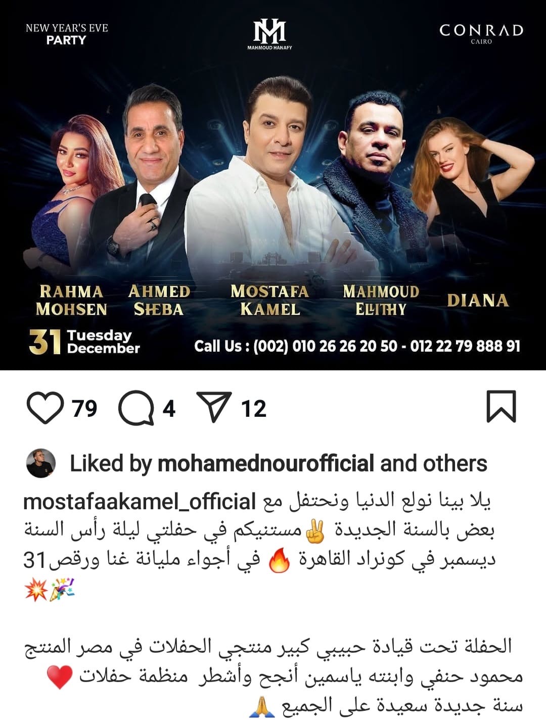 علق عليه قائلاً: "يلا بينا نولع الدنيا ونحتفل مع بعض بالسنة الجديدة مستنيكم في حفلتي ليلة رأس السنة 31 ديسمبر في كونراد القاهرة في أجواء مليانة غنا ورقص الحفلة تحت قيادة حبيبي كبير منتجي الحفلات في مصر المنتج محمود حنفي وابنته ياسمين أنجح وأشطر منظمة حفلات.. سنة جديدة سعيدة على الجميع".