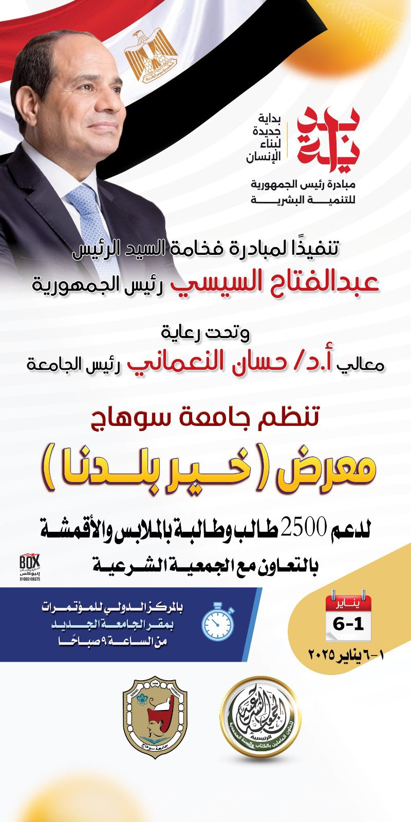 تنظم جامعة سوهاج، بالتعاون مع الجمعية الشرعية الرئيسية معرض "خير بلدنا"، والذي يستهدف 2500 طالب وطالبة من ( ذوي الهمم، وأبناء أسر تكافل وكرامة، والفتيات اليتيمات) من أبناء محافظة سوهاج، وذلك يوم الأربعاء القادم 1 يناير 2025، بالمركز الدولي للمؤتمرات في تمام الساعة 9 صباحاً.