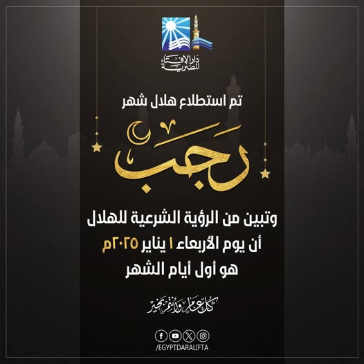 استطلعت دار الإفتاء المصرية، هلال شهر رجب لعام ١٤٤٦هـ، وغدا الأربعاء الموافق الأول من شهر يناير لعام ألفين وأربعة وعشرين ميلاديًّا هو أول أيام شهر رجب.