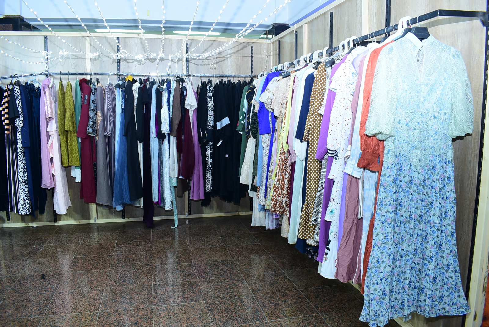 ان المعرض يضم عدد كبير من قطع الملابس والأقمشة مختلفة الأنواع، والتي يتم توزيعها على الطلبة والطالبات حسب المقاسات واختياراتهم للملابس.