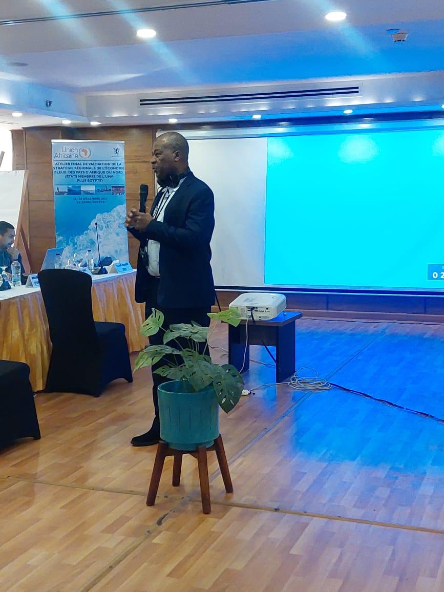 كماأكدت على أهمية وجود استراتيجية إقليمية للاقتصاد الأزرق، مشددة على أن ذلك يمثل ضرورة لتحقيق التكامل الإقليمي وضمان الاستخدام المستدام للموارد البحرية المشتركة ثم تقدمت بالشكر والتقدير  للدكتورة إلهام علي محمود- أستاذعلوم المحيطات  وخبيرالبيئة المائية والساحلية والمستشار البيئي بالهيئة القومية للاستشعار عن بعد وعلوم الفضاء -على الجهود الكبيرة والمتميزة التي بذلتها في وضع استراتيجية الاقتصاد الأزرق، والتي تم اعتمادها بنجاح خلال أعمال هذه الورشة حيث كان لعملها الدؤوب وإسهاماتها القيمة الدور الأساسي في تحقيق التوافق الإقليمي حول هذه الاستراتيجية الهامة، ما يعكس التزامها الراسخ بتعزيز التنمية المستدامة في المنطقة واشارت الى ان السيد اللواء الحسين فرحات يثمن الدور القيادى للاتحاد الافريقي في تعزيز العمل المشترك بين الدول الإفريقية، يبذل جهوداً استثنائية في دعم وتطوير الاقتصاد الأزرق وان هذه الورشة تاتى ضمن سلسلة من المبادرات التي تهدف إلى تعزيز الوعي بأهمية هذا النهج وتوفير الدعم الفني للدول الأعضاء من أجل بناء استراتيجيات وطنية وإقليمية مستدامة.
