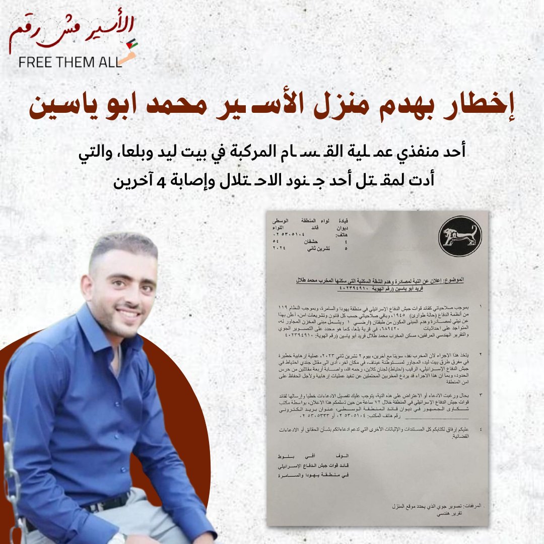 يذكر أن أبو ياسين اعتقل في 18 يناير 2024، وأخر الاحتلال بهدم منزل عائلة الأسير محمد طلال أبو ياسين.