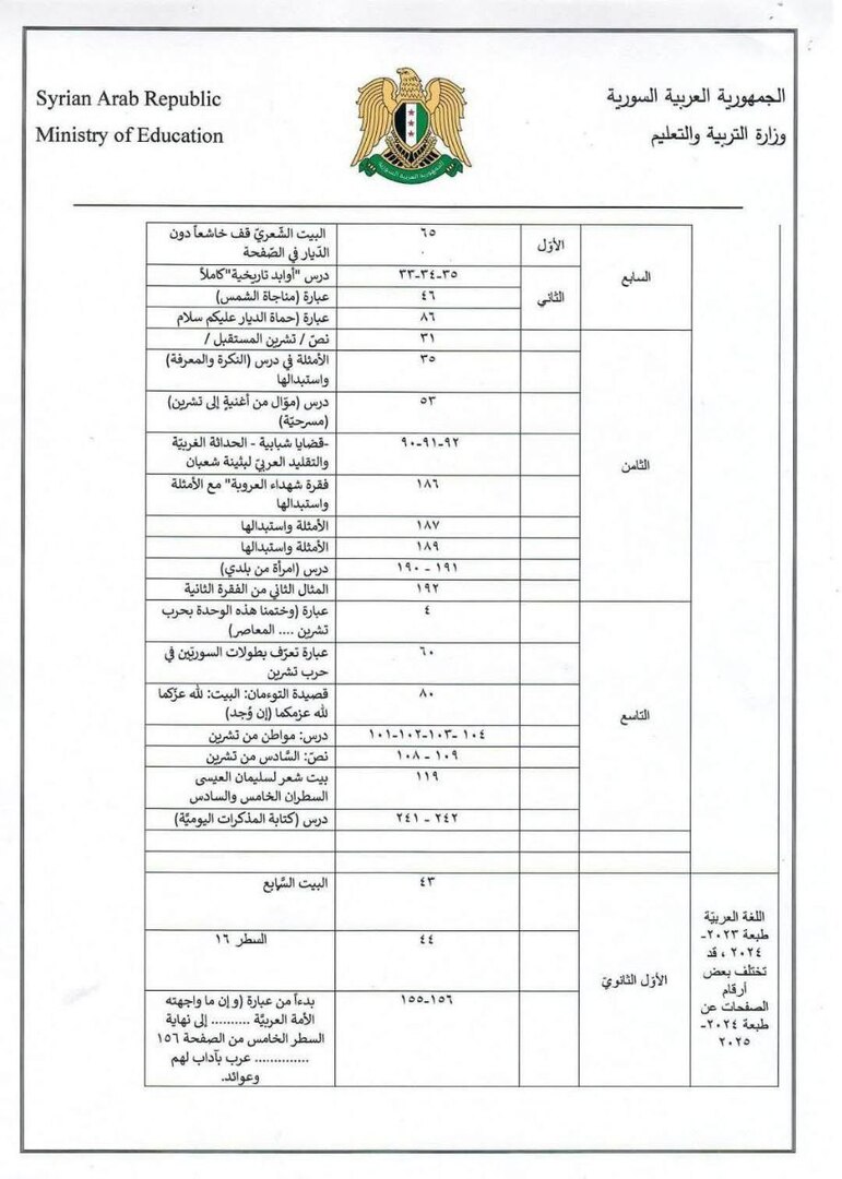 وأيضا حذف رموز النظام السوري السابق وإلغاء مادة " التربية القومية"، والفقرات المتعلقة بـ "حرب تشرين التحريرية"، بالإضافة إلى الصور والرسومات المتعلقة بها.