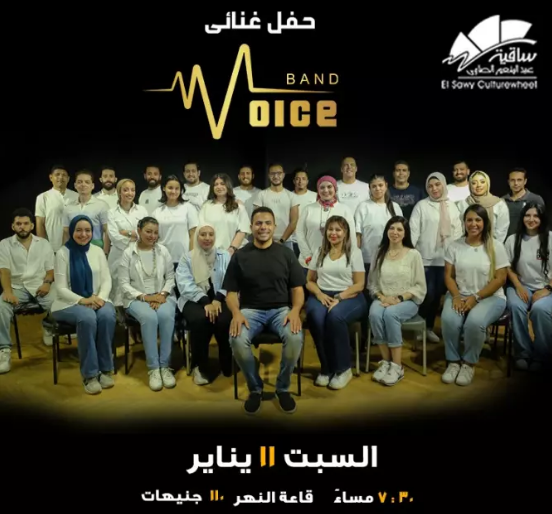 تقدم فرقة "فويس باند" رؤية وقيادة المايسترو إسلام جاد، حفلًا غنائيًا بقاعة النهر في ساقية عبدالمنعم الصاوي، في السابعة ونصف مساء السبت المقبل 11 يناير، وسعر التذكرة 110 جنيه.