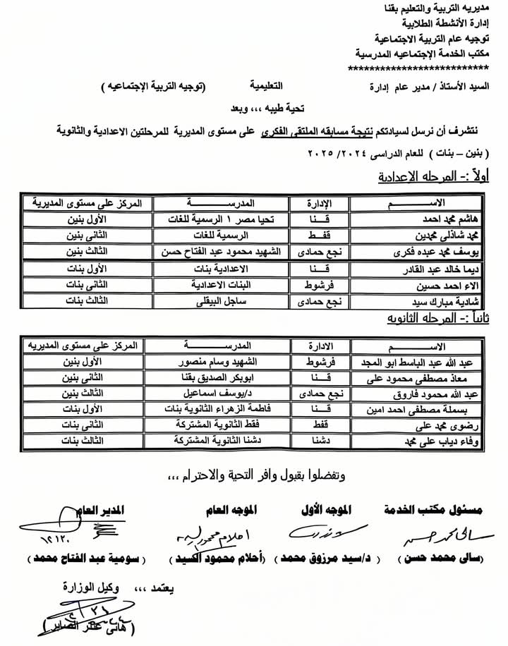أعلنت مديرية التربية والتعليم بقنا نتيجة مسابقة الملتقى الفكرى للمرحلتين الإعدادية، والثانوية، والتي نظمها توجيه عام التربية الاجتماعية بالمديرية، وفق خطة العمل للعام الدراسى 2024/2025 م.