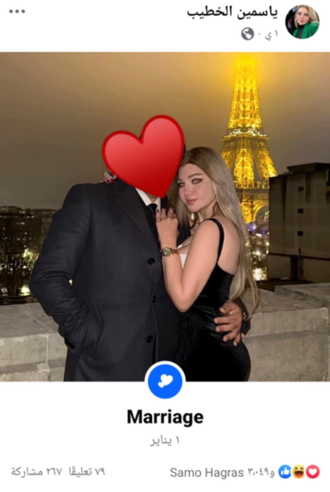 فاجئت الإعلامية ياسمين الخطيب متابعيها بزواجها للمرة الخامسة حيث نشرت عبر صفحتها الرسمية على موقع فيسبوك صورة تجمعها بزوجها الذي اختارت اخفاء هويته، وذلك من أمام برج إيفيل بفرنسا.