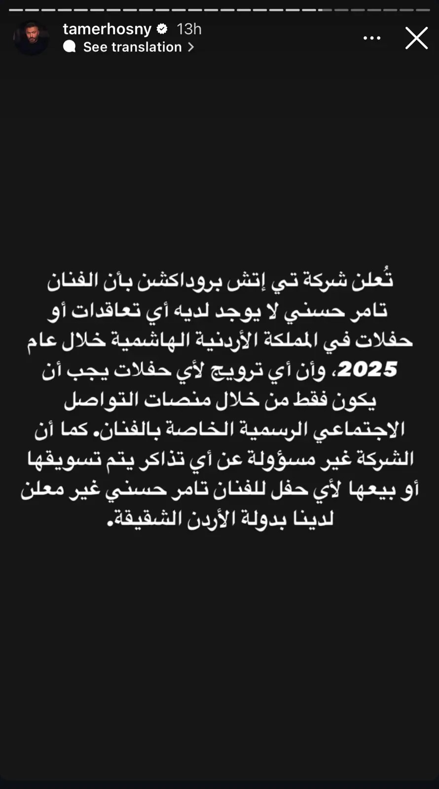 وكتب تامر حسني، عبر خاصية الاستوري، قائلًا: "تُعلن شركة تي إتش بروداكشن بأن الفنان تامر حسني لا يوجد لديه أي تعاقدات أو حفلات في المملكة الأردنية الهاشمية خلال عام 2025".