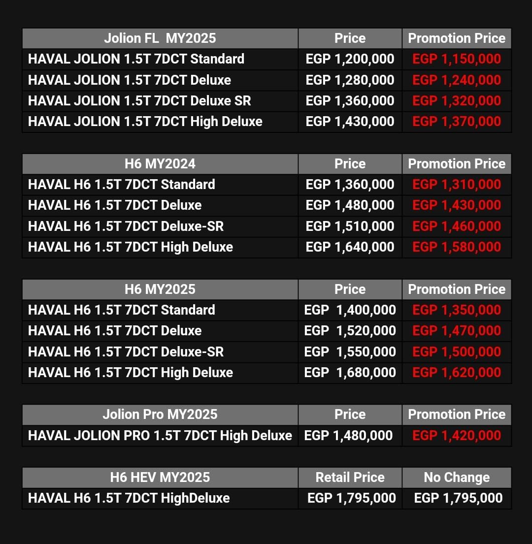 وضمت قائمة أسعار سيارات هافال الجديدة طرازات جوليون FL موديل 2025، وh6 موديل 2024، وh6 موديل 2025، وجوليون برو موديل 2025، وh6 هايبرد موديل 2025.
