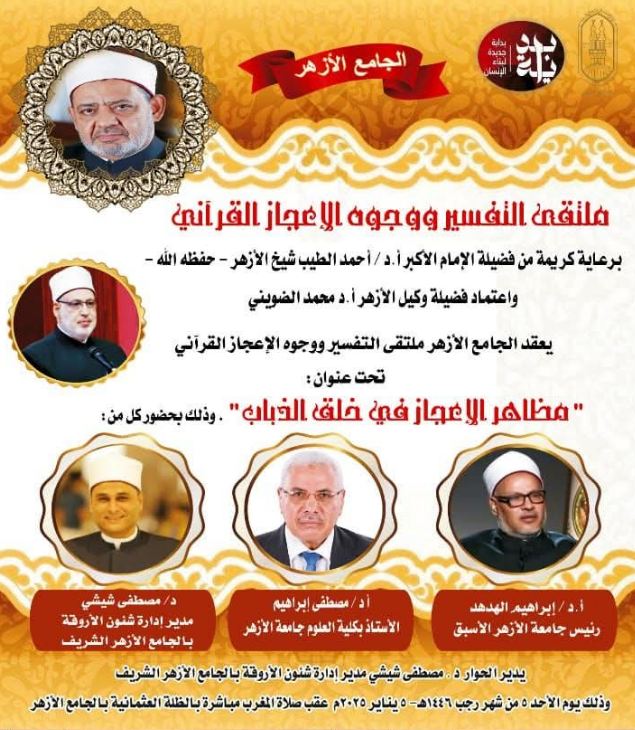 برعاية كريمة من فضيلة الإمام الأكبر أ.د أحمد الطيب، شيخ الأزهر الشريف، وبتوجيهات فضيلة أ.د محمد الضويني، وكيل الأزهر، يواصل ملتقى التفسير بالجامع الأزهر غدًا لقاء التفسير السادس بعنوان "مظاهر الإعجاز في خلق الذباب"، وذلك بحضور كل من: الدكتور إبراهيم الهدهد، رئيس جامعة الأزهر الأسبق، والدكتور مصطفى إبراهيم، الأستاذ بكلية العلوم جامعة الأزهر، ويدير الحوار، الدكتور مصطفى شيشي، مدير إدارة شئون الأروقة بالجامع الأزهر.