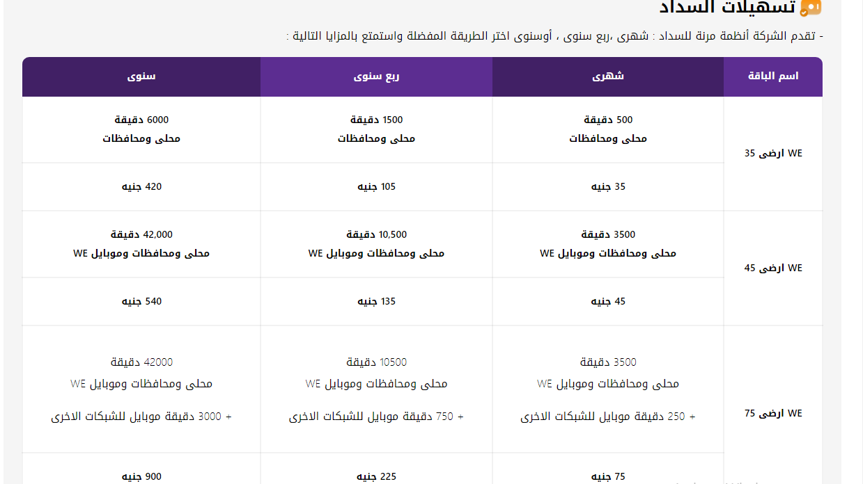 3500 دقيقة محلي ومحافظات وموبايل "وي" بسعر 45 جنيهًا، ومع الضريبة يصبح السعر 51.76 جنيه. - الاشتراك ربع السنوي: