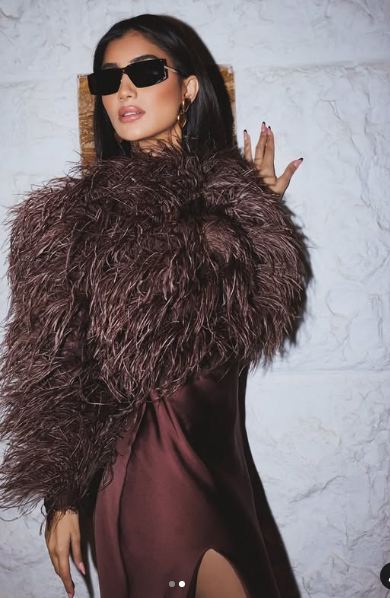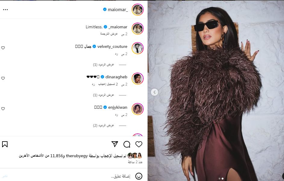 وبدت مي عمر بإطلالة عصرية تميل للجرأة، حيث ارتدت فستانًا طويلًا مجسمًا، صمم من قماش اللاميه بلون البني الغامق اتسم الفستان بشق كشف عن احدى ساقيها بشكل جريء ونسقت عليه بالطو صمم من الفرو الناعم بنفس لون الفستان.