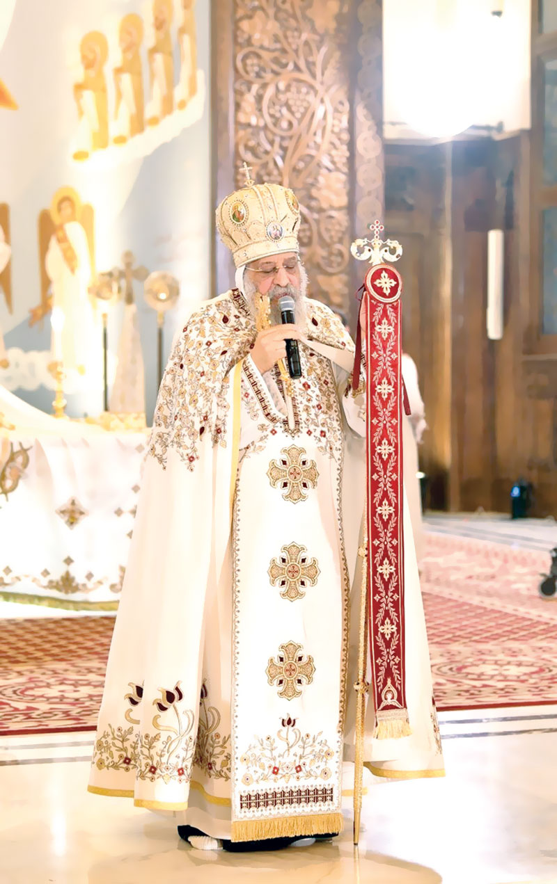 وقال: «إن الكنيسة تصلى، وتطلب من الله أن تنتهى الحروب من العالم، وأن تنتصر الإنسانية لحق الحياة للشعوب، وأن يحفظ الله بلادنا، وأن تكون محاطة بسياج من جيشها، وشرطتها، قائمة على أعمدة راسخة بمؤسساتها، محمية بتماسك شعبها، ودماء شهدائها، وأن تكون الملجأ الآمن للأمن والأمان».