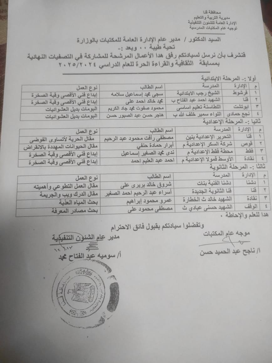 أعلنت مديرية التربية والتعليم بقنا، أسماء الطلاب الفائزين في مسابقة " الثقافية والقراءة الحرة "والتى نظمها توجيه عام المكتبات لجميع المراحل التعليمية على مستوى المديرية للعام الدراسي 2024-2025م ، و يتم تصعيدهم للتصفيات النهائية على مستوى الجمهورية .