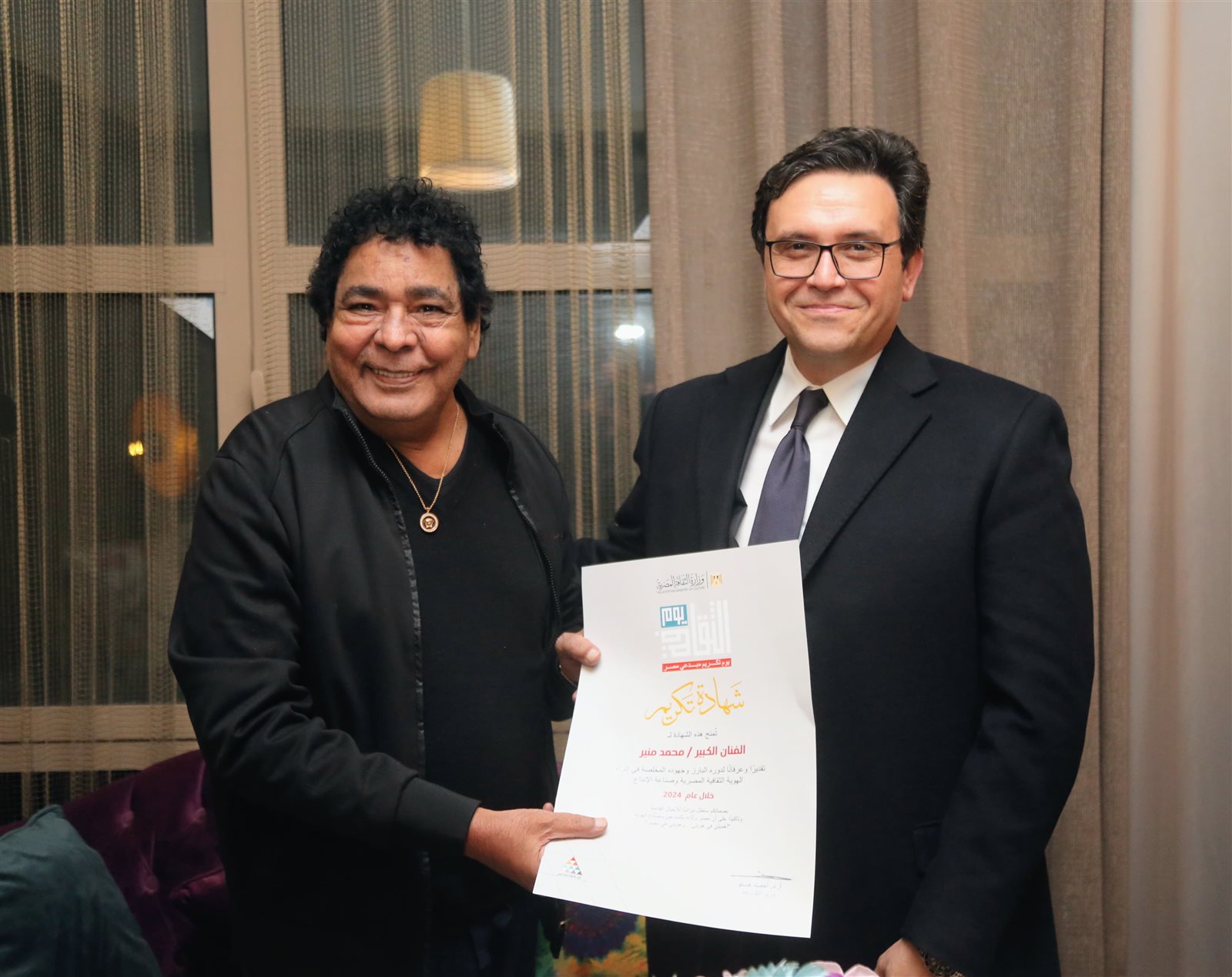 من جانبه، عبّر الفنان محمد منير عن سعادته واعتزازه بهذا التكريم، قائلاً: "فخور أنني صناعة مصرية، وطوال أكثر من 30 عامًا كنت أحمل اسم مصر في المحافل الدولية. لذا كنت دائمًا حريصًا على أن أكون سفيرًا مشرفًا لبلادي".