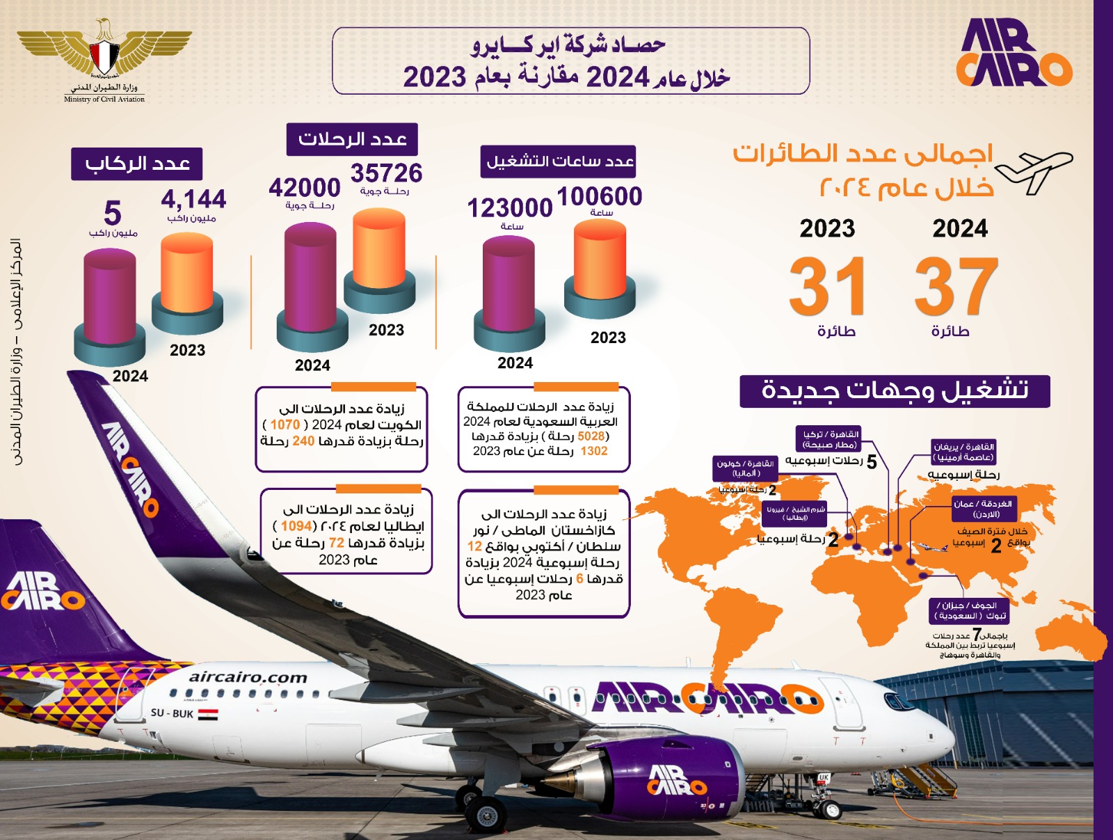 إجمالى عدد الطائرات خلال عام 2024 ( 37 ) طائرة (28 من طراز ايرباصA320 و من 6طراز ATRو 3 من طراز Embraer) مقارنة باجمالى عدد الطائرات خلال عام 2023(31 طائرة)