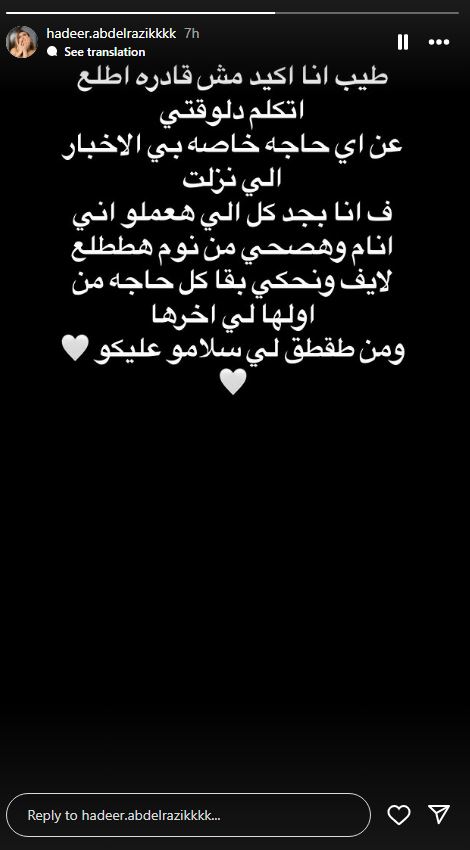 وكتبت هدير عبد الرازق: "أنا أكيد مش قادرة اتكلم دلوقتي عن أي حاجة خاصة بالأخبار اللي نزلت عني، وأنا كل اللي هعمله دلوقتي هو أني هنام وهصحى من النوم هطلع احكيلكم كل حاجة من طقطق لسلامو عليكو".