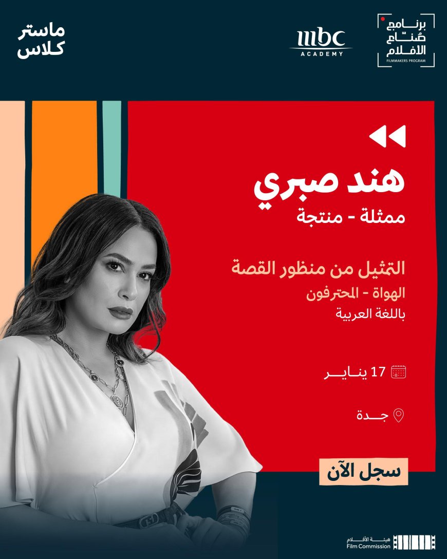 تنظم هيئة الأفلام السعودية ضمن برنامجها صناع الأفلام "ماستر كلاس" بعنوان "التمثيل من منظور القصة" بالشراكة مع أكاديمية MBC كفرصة لنقل تجربة الفنانة والممثلة هند صبري في تحليل النصوص الدرامية.