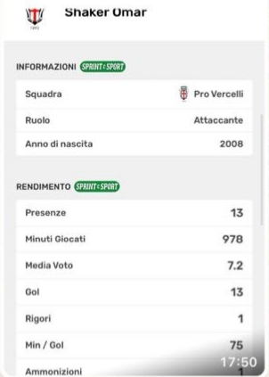 ولفت عمر شاكر البالغ من العمر 16 عامًا، الأنظار بقوة خلال الموسمين الماضيين مع فريقه بروفيرشيلي الايطالي، حيث توج بلقب هداف ليجا برو، عن موسم 2022\2023 برصيد 29 هدفًا وهو ما جعله يلفت أنظار الجميع بعد مهاراته التهديفية الكبرى.
