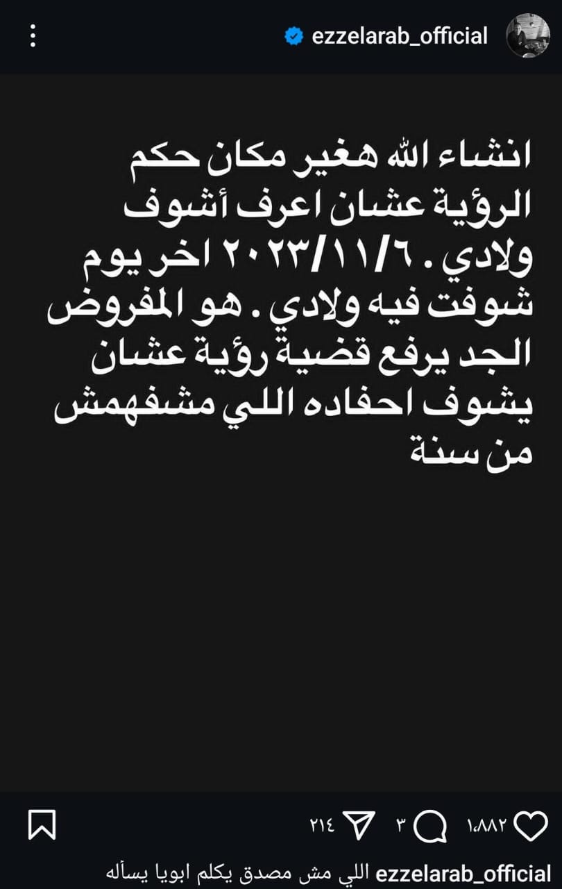 ولم تكن هذه هي المرة الأولى التي يستغيث فيها عز العرب ويناشد المسؤولين بالتدخل ، حيث نشر مسبقًا أيضًا منشور عبر حسابه الرسمي بموقع استجرام قائلًا: «إن شاء الله هغير مكان حكم الرؤية عشان اعرف أشوف ولادي.. ٢٠٢٣/١١/٦ آخر يوم شوفت فيه ولادي هو المفروض الجد يرفع قضية رؤية عشان يشوف أحفاده اللي مشفهمش من سنة».