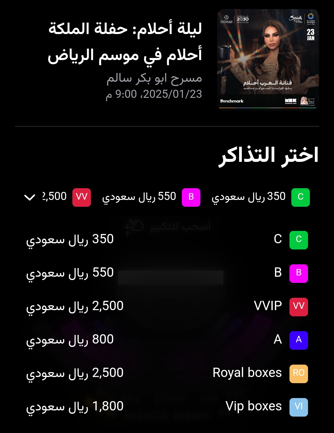 أسعار تذاكر حفل أحلام الشامسي بموسم الرياض