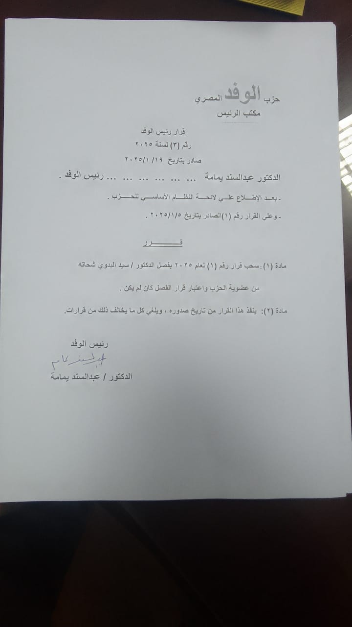 أصدر الدكتور عبدالسند يمامة، رئيس حزب الوفد، قرارًا بسحب قرار فصل الدكتور السيد البدوي شحاتة من حزب الوفد.