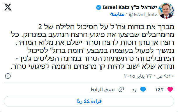 وكتب كاتس في منشور عبر منصة "إكس": "نهنئ قوات الجيش الإسرائيلي على تصفيتها الليلة لاثنين من الإرهابيين اللذين نفذا عملية القتل البشعة في قرية الفندق"، مشددا على أن "كل قاتل أو راعي للقتل والإرهاب سيدفع الثمن".