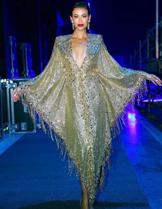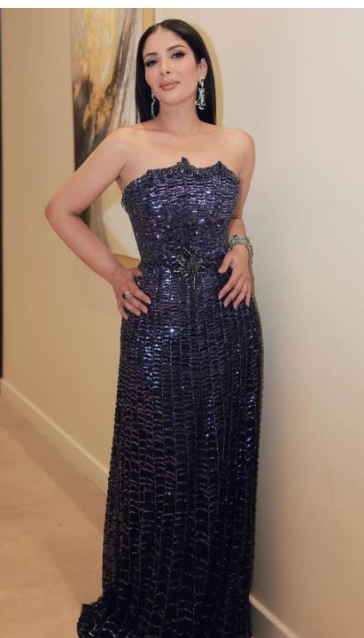 عكست أمل عرفت خبرتها الطويلة في عالم الأزياء عند اختيارها لإطلالتها التي مزجت بين القماش اللماع المصمم من الترتر مع المخمل، بلمسة أنيقة مفعمة الاحتشام اللافت يليق بأجواء السجادة الخزامية؛ لتتألق بإطلالة ساحرة من توقيع اليزابيتا فرانكي Elisabetta Franchi.