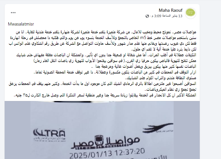 شركة "مواصلات مصر" هي إحدى الشركات الرائدة في مجال النقل الحضري الذكي في مصر، ورغم النجاح الذي حققته الشركة في توفير حلول نقل مبتكرة ومستدامة، إلا أنها تواجه العديد من الشكاوى والانتقادات من المستخدمين، خصوصًا فيما يتعلق بارتفاع الأسعار.