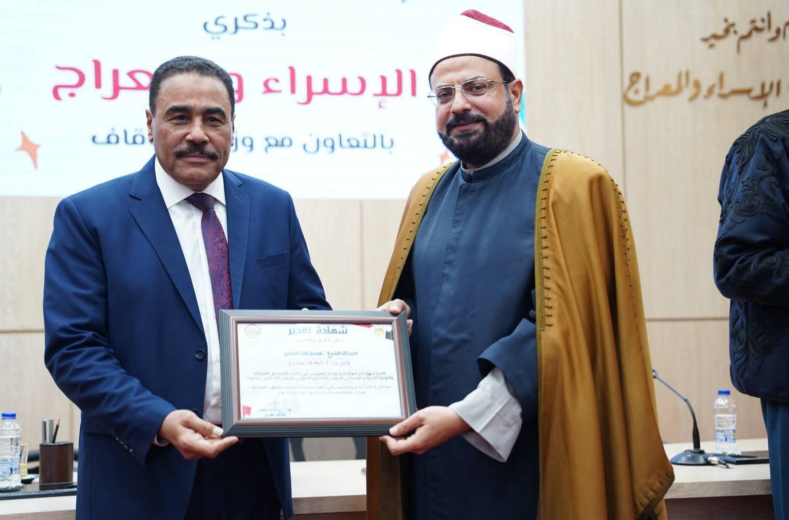 وفي نهاية الاحتفالية كرم اللواء خالد شعيب محافظ مطروح فضيلة الشيخ حسن عبد البصير وكيل وزارة الأوقاف تقديراً لجهوده في الدعوة الدينية والمساعى الحميدة في إصلاح ذات البين والاحكام الشرعية وكذلك إنشاء العديد من المساجد الجامعة بمطروح، كما تم تكريم عدد من العاملين بالأوقاف بمطروح لجهودهم المبذولة.