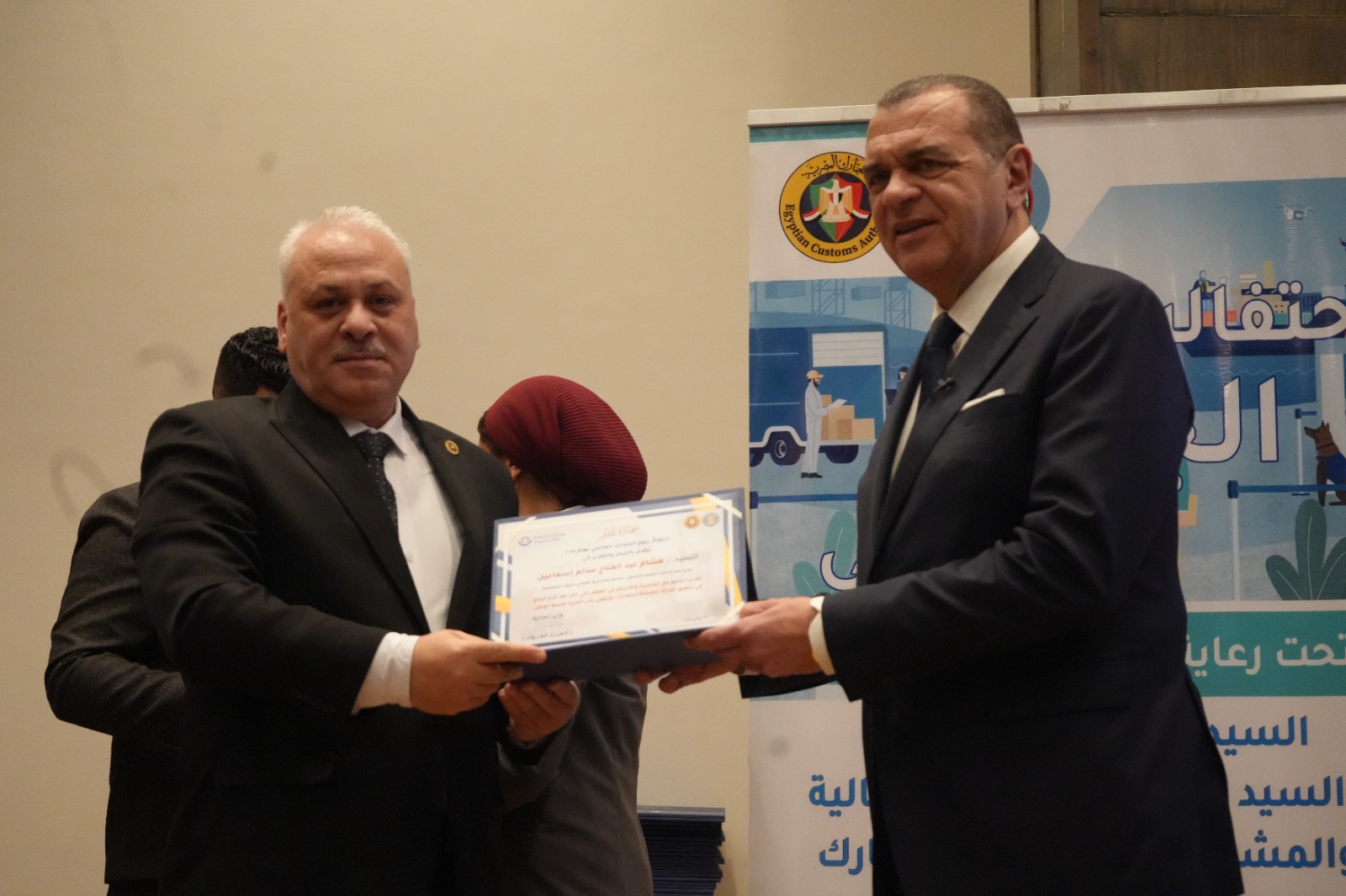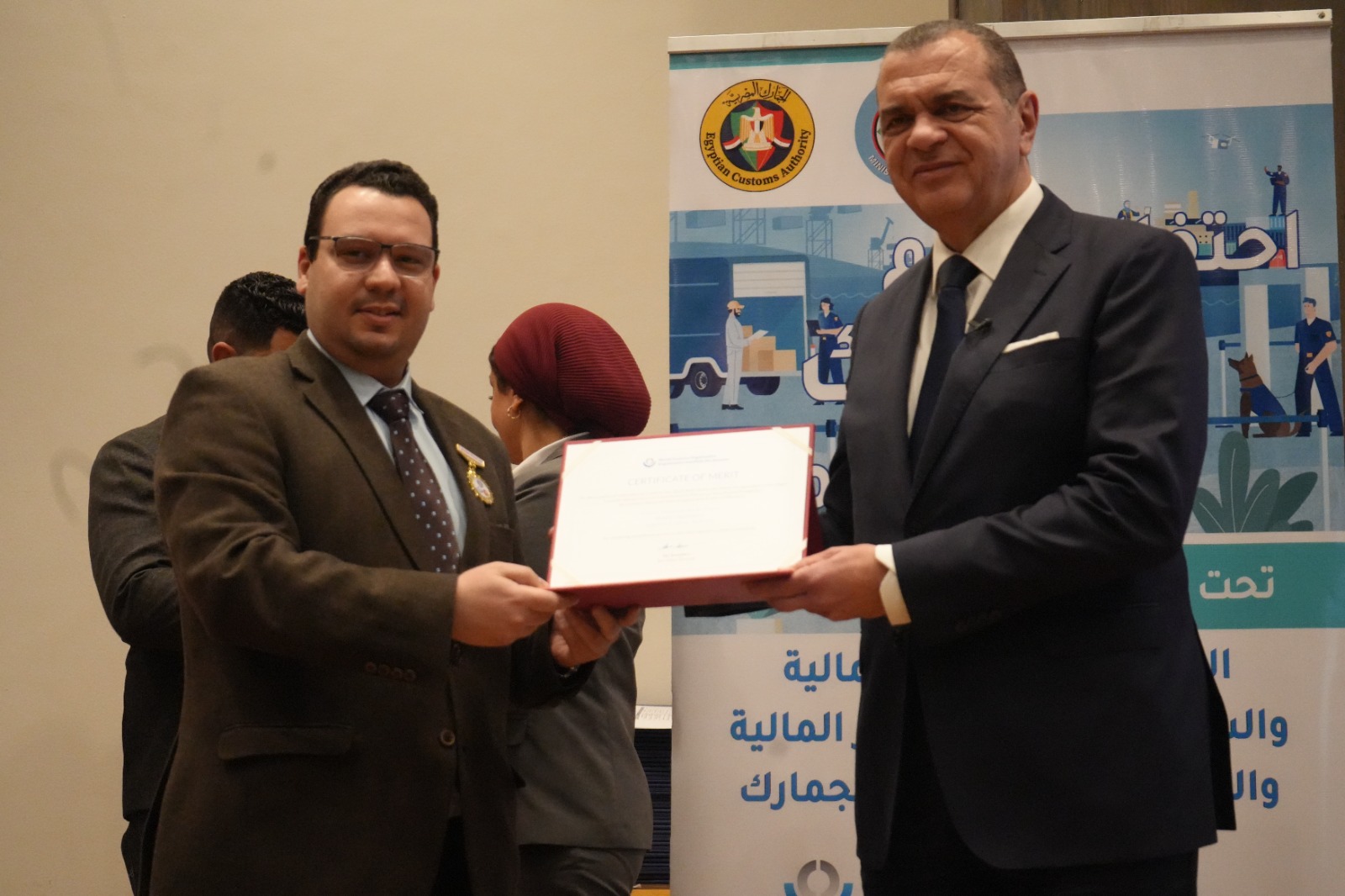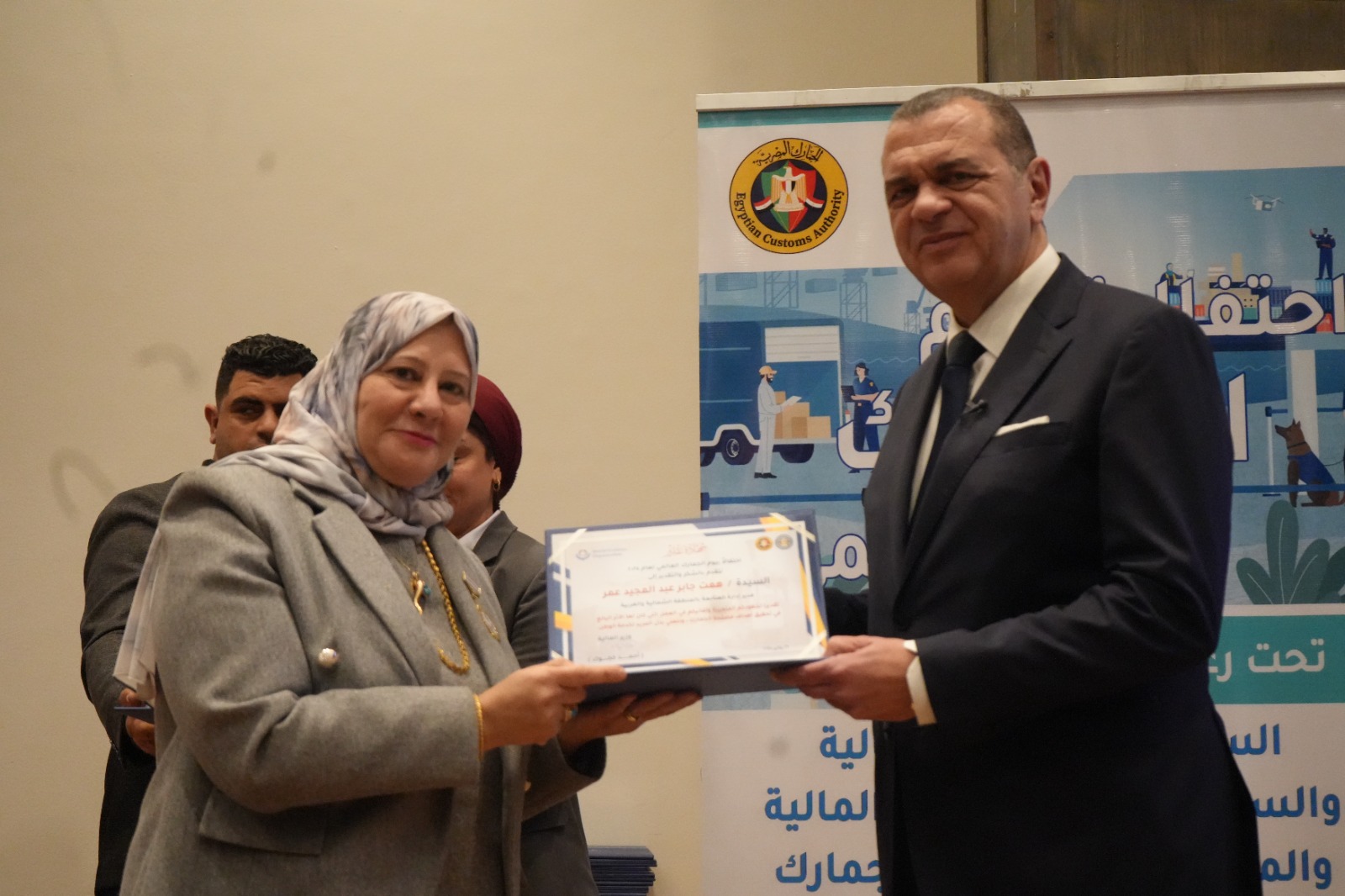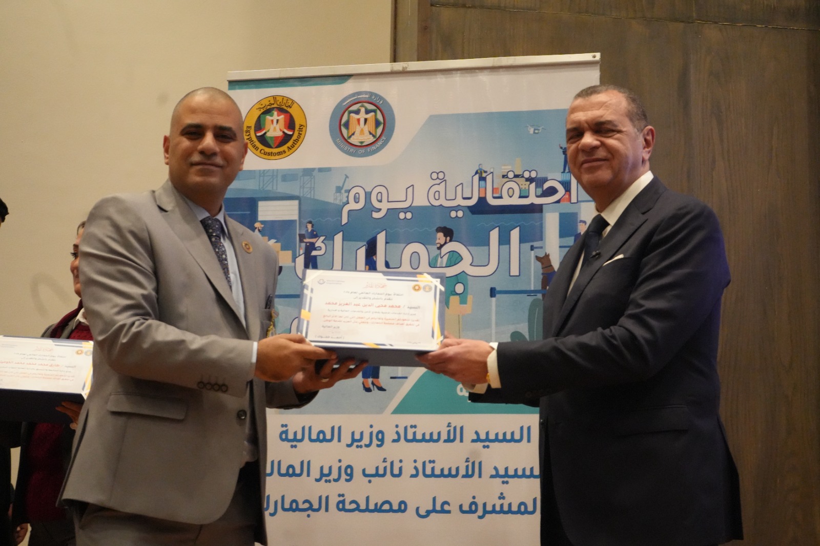 كما قام بتكريم العاملين المتميزين لتحفيزهم على مواصلة جهودهم للارتقاء بالمنظومة الجمركية، وهم: أحمد أبو الحسن رئيس الإدارة المركزية لشئون مكتب رئيس مصلحة الجمارك، وأحمد القرنشاوي رئيس الإدارة المركزية لجمارك الإسكندرية، ومها ماهر مدير عام خدمة العملاء بالإدارة المركزية لبرامج المشغل الاقتصادي، وأمل عبد الفتاح مديرعام مبادرات التطوير والإصلاح الجمركي، ومصطفي محمد عبد الفضيل مدير عام العلاقات العامة، ومحمد محمود مدير عام جمرك طرود البريد بالإدارة المركزية للصادرات والواردات الجوية، ونصره علي مدير إدارة تحليل نظم التعريفة بالإدارة المركزية للسياسات والإجراءات، وصافيناز مصطفى مدير إدارة المتابعة بالإدارة المركزية لجمارك المنطقة الغربية، وطه حسين عبد العزيز مدير إدارة المكتب الفني بالإدارة المركزية لتكنولوجيا الالتزام، وروفائيل سليمان مدير إدارة المكافحة بالقاهرة بالإدارة المركزية لدعم العمليات بمنطقة الوسطى والجنوبية.