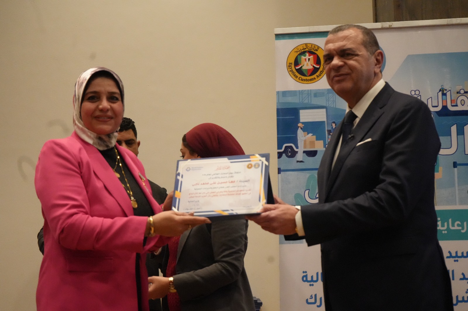 ومن المكرمين: محمد عبد القادر مدير الإدارة الإلكترونية للتعريفة بالإدارة المركزية للتعريفة والقيمة والمنشأ، وصلاح محمد مدير إدارة المكتب الفني بالإدارة المركزية لشئون مكتب رئيس المصلحة، وريهام أحمد مدير إدارة المكتب الفني بالإدارة المركزية للتطوير والإصلاح الجمركي، ونهى صبحي مدير إدارة الاتصال الخارجي بالإدارة المركزية للتعاون الدولي، وحسام سيد رئيس قسم البحوث بالإدارة المركزية لجمارك القاهرة، وياسر جمال محمد رئيس قسم بالمكتب الفني بالإدارة المركزية لدعم العمليات بالمنطقة الشرقية، ورمضان حسين رئيس قسم بالإدارة العامة للعمالة والتعيينات بقطاع الموارد البشرية، ومحمد السيد رئيس قسم بالإدارة العامة للمكافحة التهرب الجمركي بالمنطقة الوسطى والجنوبية، ومحمد جميل مدير إدارة بالوديعة بالإدارة المركزية لجمارك تفتيش الركاب بمطار القاهرة الدولي، وحسام محمد مدير إدارة مراجعة تحليل البيانات بقطاع التكنولوجيا، وأحمد إبراهيم رئيس قسم بالإدارة المركزية للركاب والأسواق الحرة، وأحمد سليم مدير إدارة تفتيش الركاب بمطار شرم الشيخ، وشهدي عيد رئيس الإدارة المركزية لشئون المجتمع التجاري، وصبحي عوض مدير عام الشئون المالية والإدارية بقطاع التكنولوجيا.